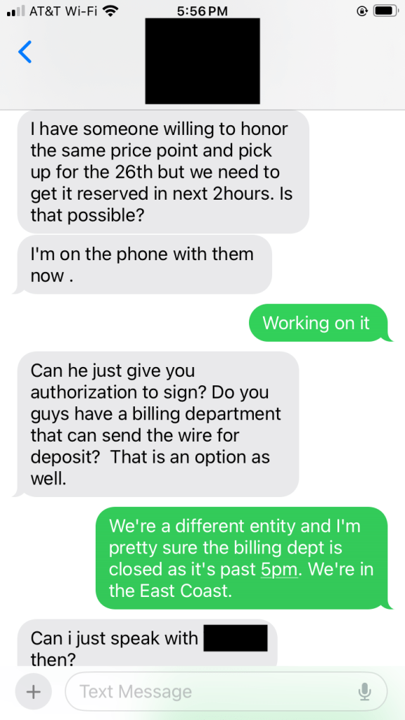 This week, a vendor we requested a proposal from started to irritate me with his rudeness and poor customer service. He was blowing up my work phone about having the proposal signed off right away. I told him that the person responsible wasn’t available to review the proposal. He started getting pushy with me. I sent a screenshot of part of the conversation we had to one of my PMs.